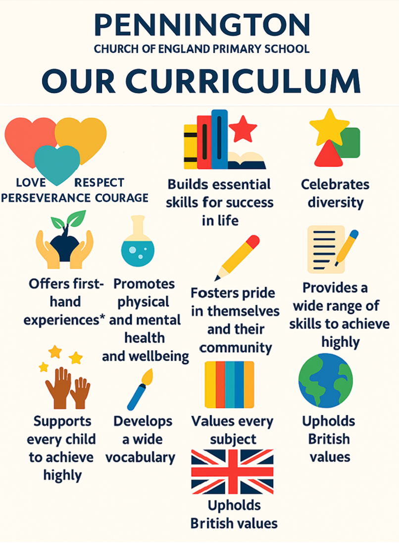 At Pennington C of E Primary School, our curriculum is rooted in our core values of Love, Respect, Perseverance, and Courage. These values shape everything we do and inspire us to create a learning environment where every child can flourish. We aim to provide a curriculum that is broad, rich, and exciting, promoting both excellence and enjoyment in every subject.