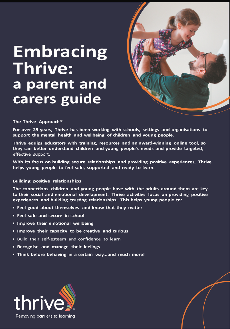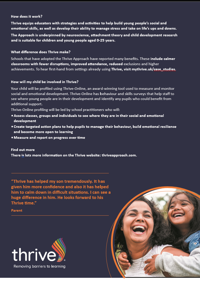 As a Thrive school, we use a deep understanding of the neuroscience behind children’s behaviour to guide our approach. This helps us create safe, nurturing relationships and environments where children can regulate their emotions, build resilience, and develop the skills they need to learn effectively. Thrive is not just about wellbeing—it is a foundation for learning, enabling children to engage confidently and achieve their potential.