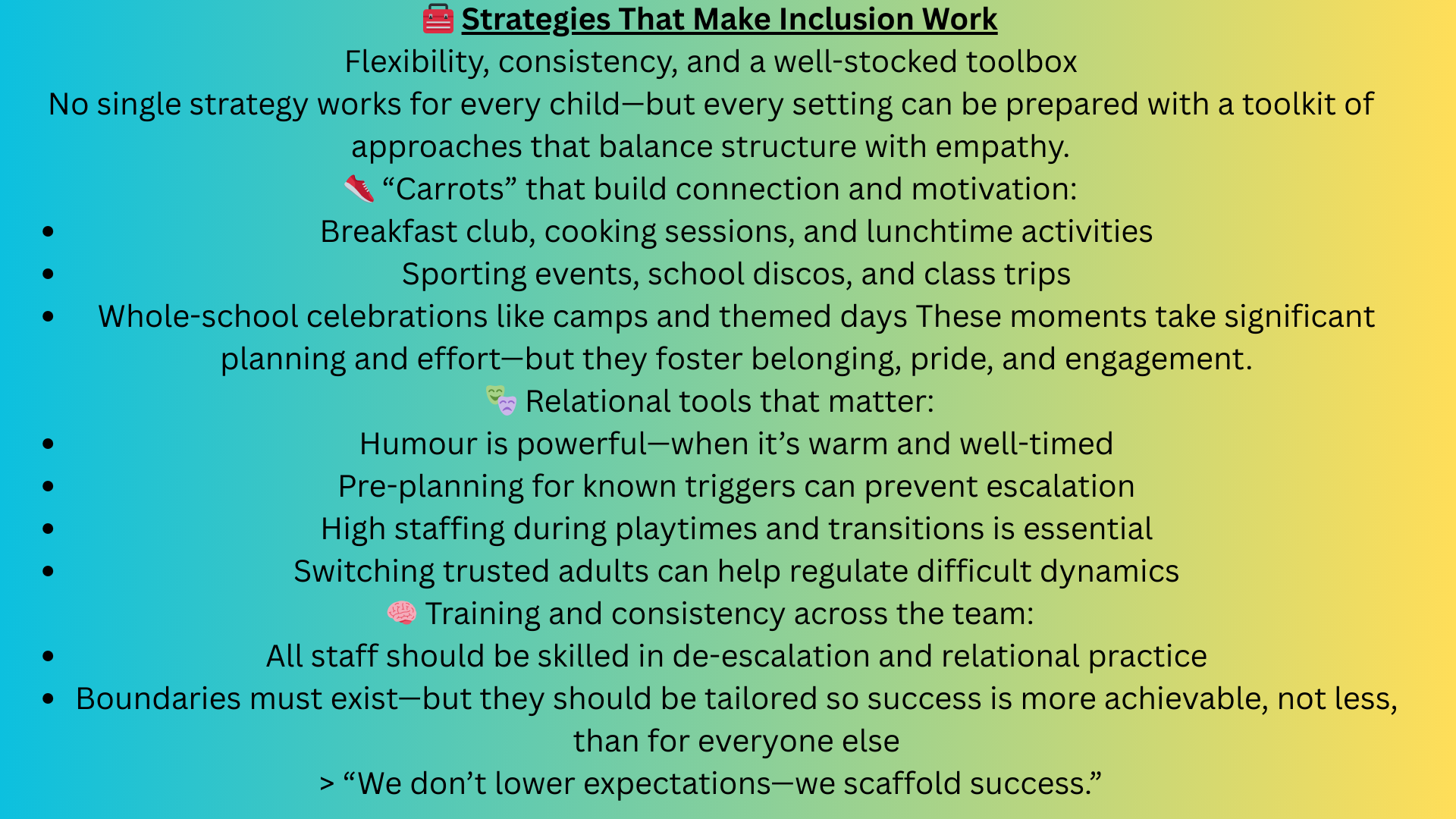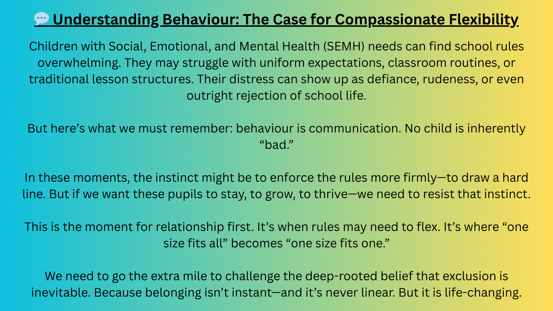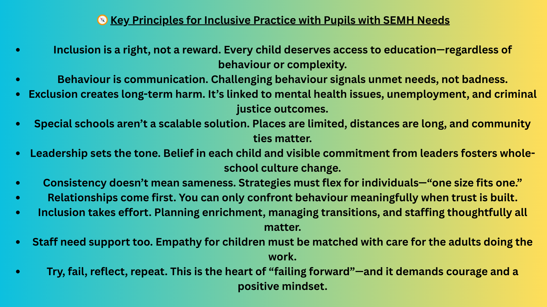 • Support for children with SEMH needs, emotionally based school avoidance, and other barriers to learning.