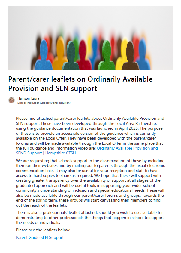 Our SEND Information Report forms part of Hampshire’s Local Offer. Click here to view Hampshire’s Local Offer
